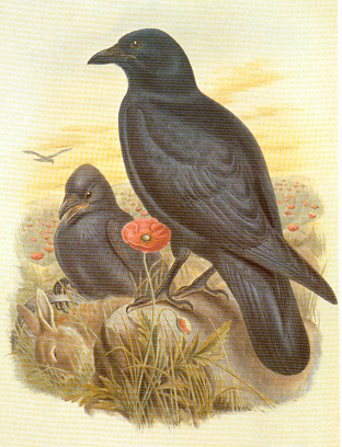 Eine der Krähen krächzt laut vor sich hin. Ihr ist etwas unheimlich in der hereinbrechenden Dunkelheit und sie gurrt in die Runde: "Haben wir schon wieder Angst vor den Hähern, oder haben die Häher noch Angst vor uns?"   Die zweite Krähe taumelt im Sturm und nörgelt: "Es gibt doch keine Häher mehr, oder wenigstens nicht so viele, dass wir vor ihnen Angst haben müssten. Die Häher sind längst von der Bildfläche verschwunden."   "Von wegen verschwunden!" Krächzt die erste Krähe, "du hast doch neulich noch mitgekriegt, wie ein paar solcher Vögel nach uns gepfiffen haben, dass wir Raben wären und hier nichts verloren hätten. 'Raben runter!' Ha'm sie gekhräht. Da fliege ich doch wohl richtig in der Annahme, dass es sich bei denen um Häher gehandelt hat."   "Wir sind aber keine Raben", gurgelt die dritte Krähe, die zwischen den beiden gegen Wind und Regen keucht. "Raben sind nämlich längst ausgestorben", pflichtet ihr die andere bei und fliegt eine Spanne weit nach rechts rüber zu der, die festgestellt hatte, dass Krähen keine Raben sind.   Die Krähe, die bisher schweigend voran geflogen ist, wird von einem Windstoß erfasst und zu den drei streitenden Vögeln zurückgeworfen. Sie knarrt laut und meldet sich als vierte zu Wort: "Ausgestorben ist gut, hä... vergiftet wurden sie; die Häher haben alle Raben vergiftet."   "Und abgeschossen!" "Ja, ausgeräuchert." "Erst ham' sie die Nester kaputt geschlagen und die Raben dann in Käfige gesperrt, abtransportiert. Es sah harmlos aus wie ein Transport von Brieftauben... nur... keiner dieser Pechvögel kam jemals wieder zurück."   Der Regen wird stärker. Die fünfte Krähe hustet laut: "Elsterei, was die Häher mit den Raben gemacht haben, aber, chhhkch... mit uns können sie das nicht machen, weil wir jetzt doch viel mehr sind als sie." "Aber das Dumme ist, dass wir so wie Raben aussehen." "Genau."   Die Krähen, die schweigend hinter dem krächzenden Volk herfliegen, haben inzwischen aufgeholt und die sechste, eine besonders junge, versucht zu flöten:   "Wir sehen doch viel besser aus als Raben, und wir können schneller fliegen als sie und außerdem sind wir intelligenter. Wenn wir nicht so gegen den Wind sondern mit dem Wind fliegen würden, dann ging's noch mal so gut. Ich fürchte mich nicht vor den Hähern, ich glaube, das sind überhaupt nur Spechte."   "Halt den Schnabel, du Schwalbe, das mit der Intelligenz solltest du lieber uns überlassen" krächzt die erste Krähe, während sie sich noch mal ein paar Flügelschläge zurückfallen lässt. "Diese komischen Vögel die wir meinen, sind so braun wie Häher und sie riechen auch wie Häher."   ![]() Zeichnung: John Gould, 1804 - 1881